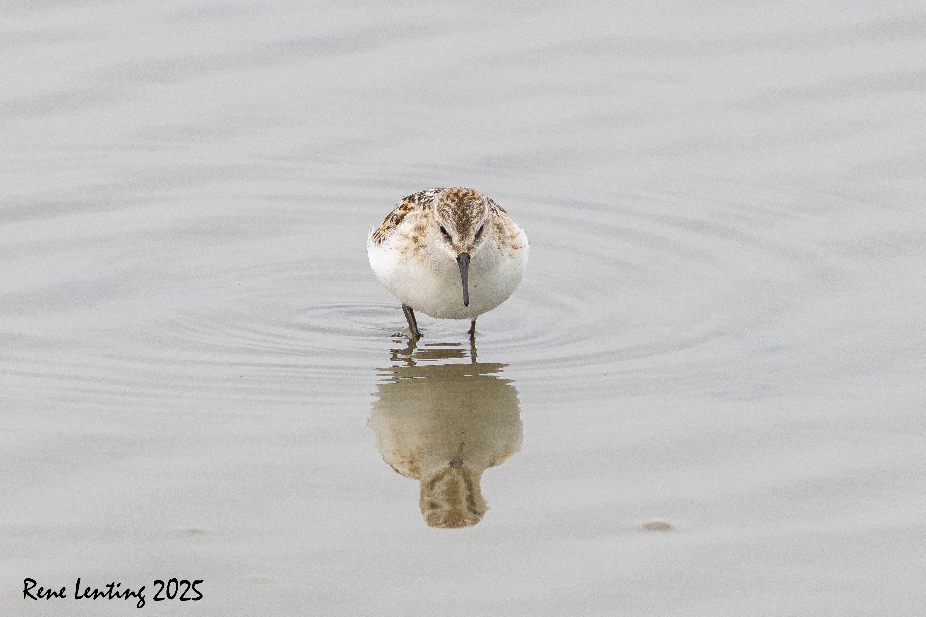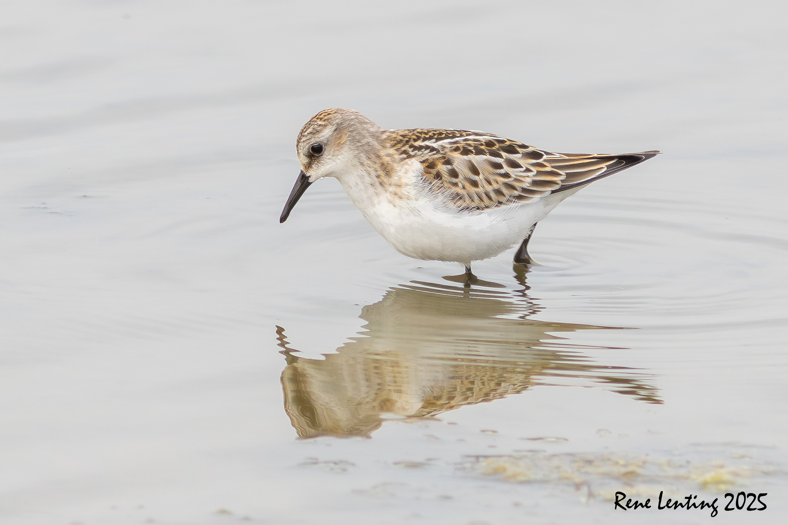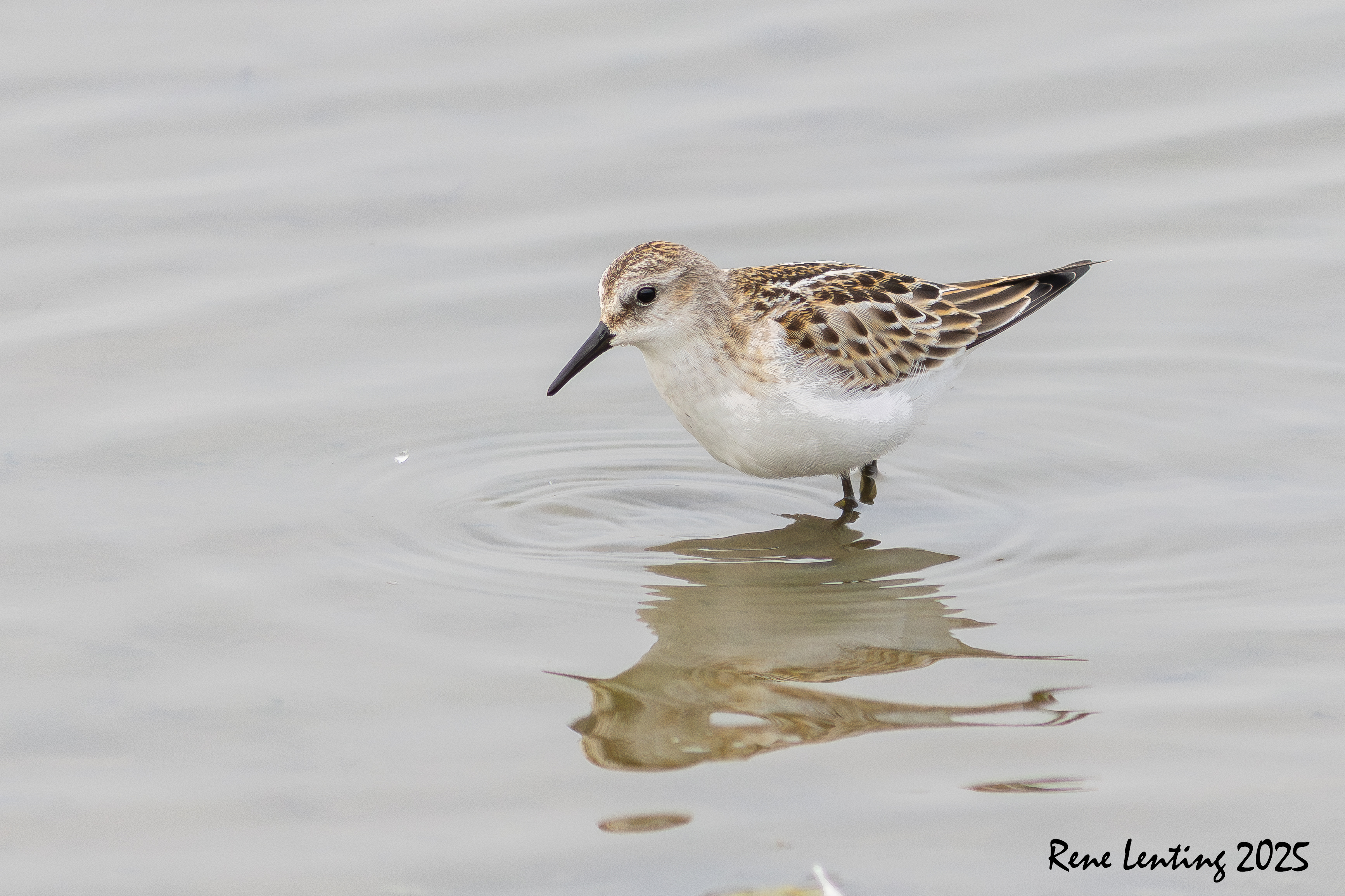 Ik besloot geduldig achter het riet te wachten totdat alle vogels ineens opvlogen omdat ze ergens van schrokken. Hierdoor vlogen een hoop strandlopers mijn richting op waarna ze op een meter op 30 afstand landden. Vooraan liep een Kleine Strandloper die vervolgens al fouragerend mijn kant op kwam lopen. Mijn geluk kon niet op toen hij tot op een meter op 5 naderde. Hierdoor kon ik hem ook nog echt mooi fotograferen. Iets wat zelden lukt doordat ze zo klein (12 cm) zijn. Blij met weer een nieuwe soort.