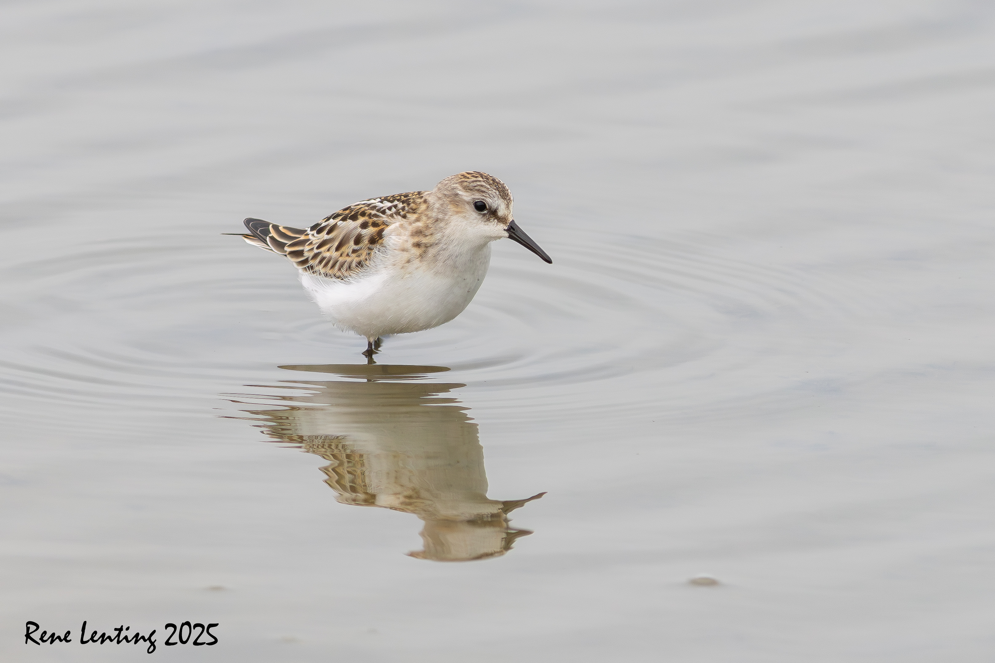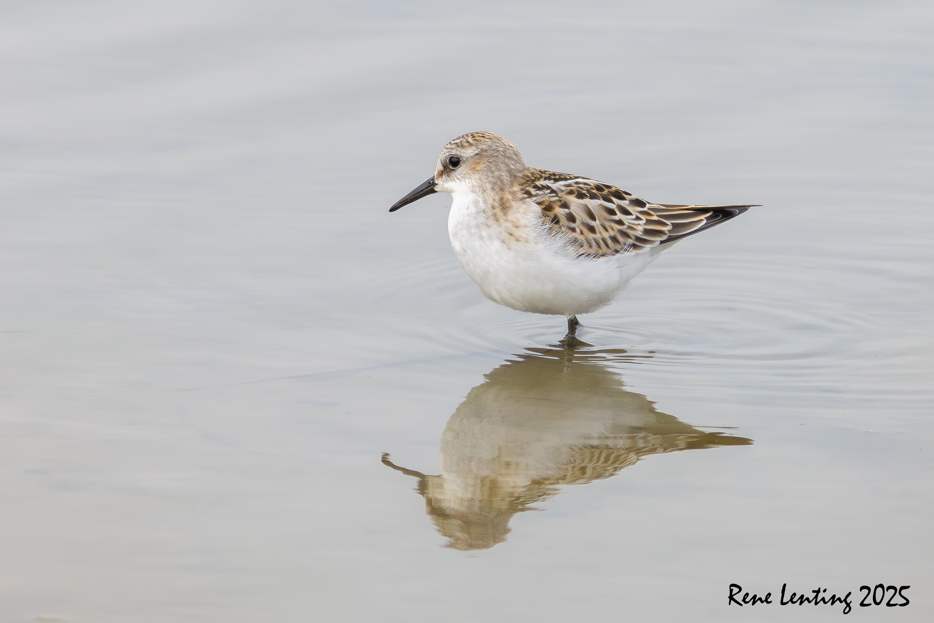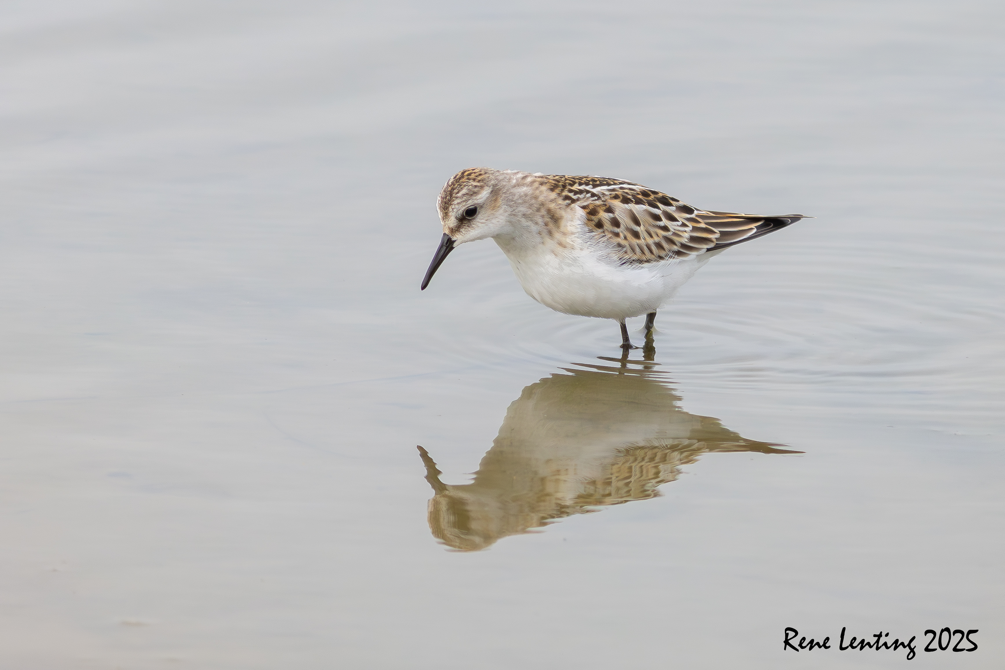 Ik besloot geduldig achter het riet te wachten totdat alle vogels ineens opvlogen omdat ze ergens van schrokken. Hierdoor vlogen een hoop strandlopers mijn richting op waarna ze op een meter op 30 afstand landden. Vooraan liep een Kleine Strandloper die vervolgens al fouragerend mijn kant op kwam lopen. Mijn geluk kon niet op toen hij tot op een meter op 5 naderde. Hierdoor kon ik hem ook nog echt mooi fotograferen. Iets wat zelden lukt doordat ze zo klein (12 cm) zijn. Blij met weer een nieuwe soort.