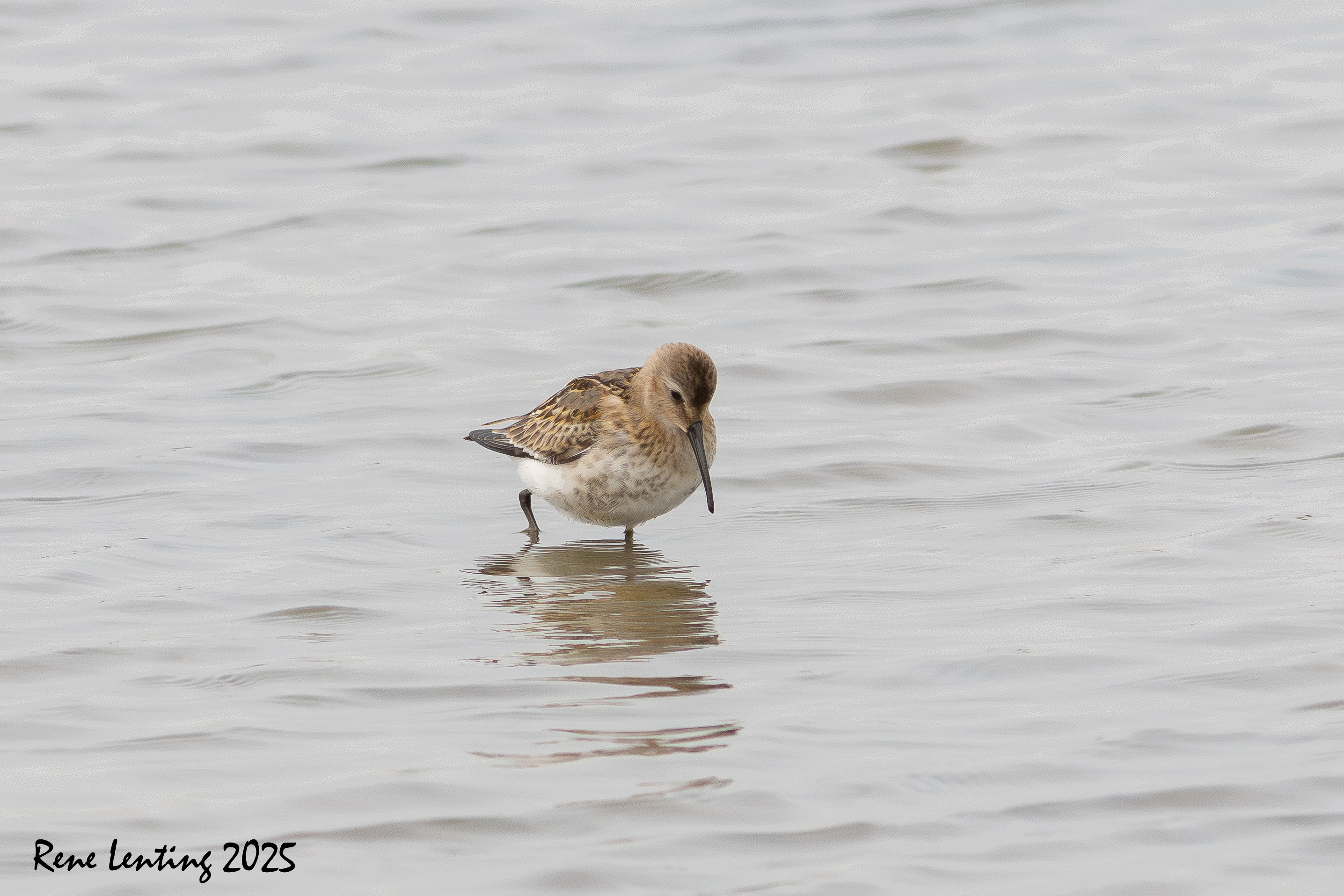 Verder zag ik een aantal Bonte Strandlopers lopen die ik kleine groepjes naar eten aan het zoeken waren. De Kleine Strandloper had ik nog niet gezien. Deze was ook een stukje verderop gemeld, dus liep ik die kant op. Ik zag een vrouw tussen het riet zitten die net opstond toen ik bij haar aankwam. Zit de Kleine Strandloper er nog, vroeg ik. Er zaten er net een aantal vlakbij de kant, hoorde ik haar zeggen, maar ze komen vast wel weer terug hoor. Ik baalde dat ik ze net gemist had en hoopte dat de vrouw gelijk zou krijgen. Door de verrekijker zag ik er wel een aantal lopen, ver weg een droge slikplaat. Te ver om er een foto van te kunnen maken.